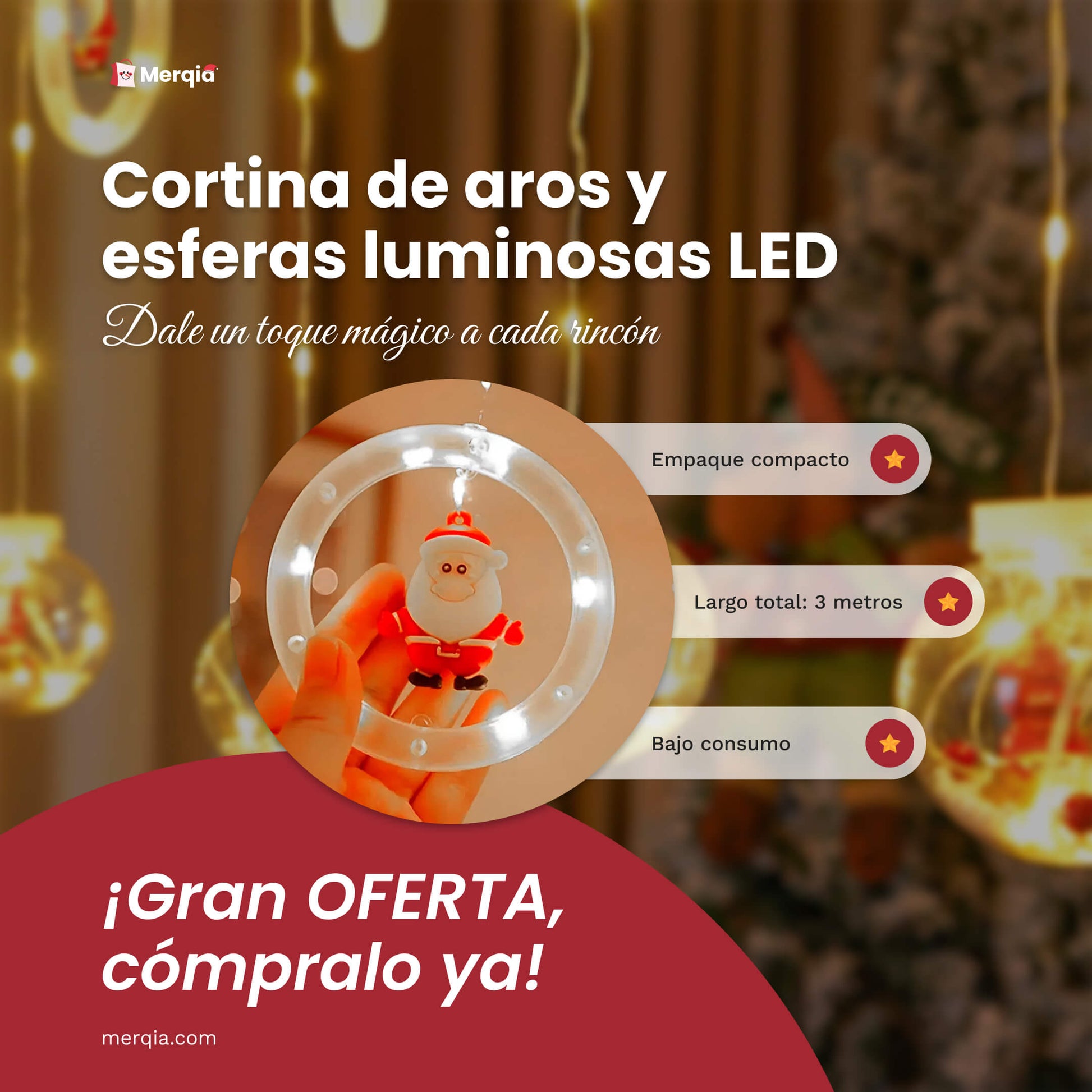 Dale vida y brillo a tus espacios con la Cortina de Aros Luminosos de Navidad. Con su diseño de 10 tiras intercaladas y 100 luces LED, esta cortina crea un espectáculo luminoso que llenará tu hogar de alegría y armonía. Ideal para decorar ventanas, barandales, balcones o establecimientos comerciales durante la temporada navideña o eventos especiales.